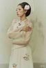 + Lớp ngoài lấy cảm ứng từ áo ngũ thân, tay liền, trang trí bằng cúc tàu tết tay + cúc chữ Hỷ mạ vàng. Lớp này được may bằng vải oganza tơ tằm 100% với hiệu ứng xuyên thấu tinh tế.